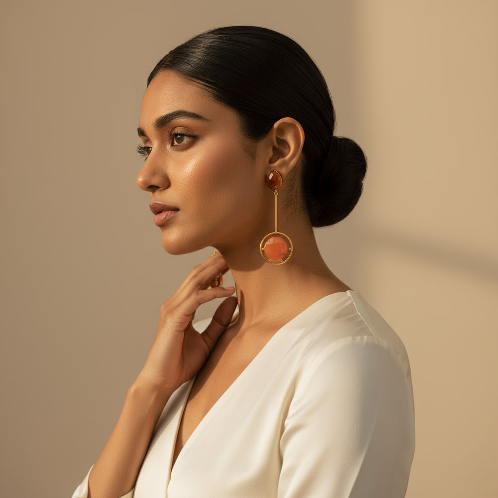 The carnelian stones set in sleek golden frames radiate warmth and confidence