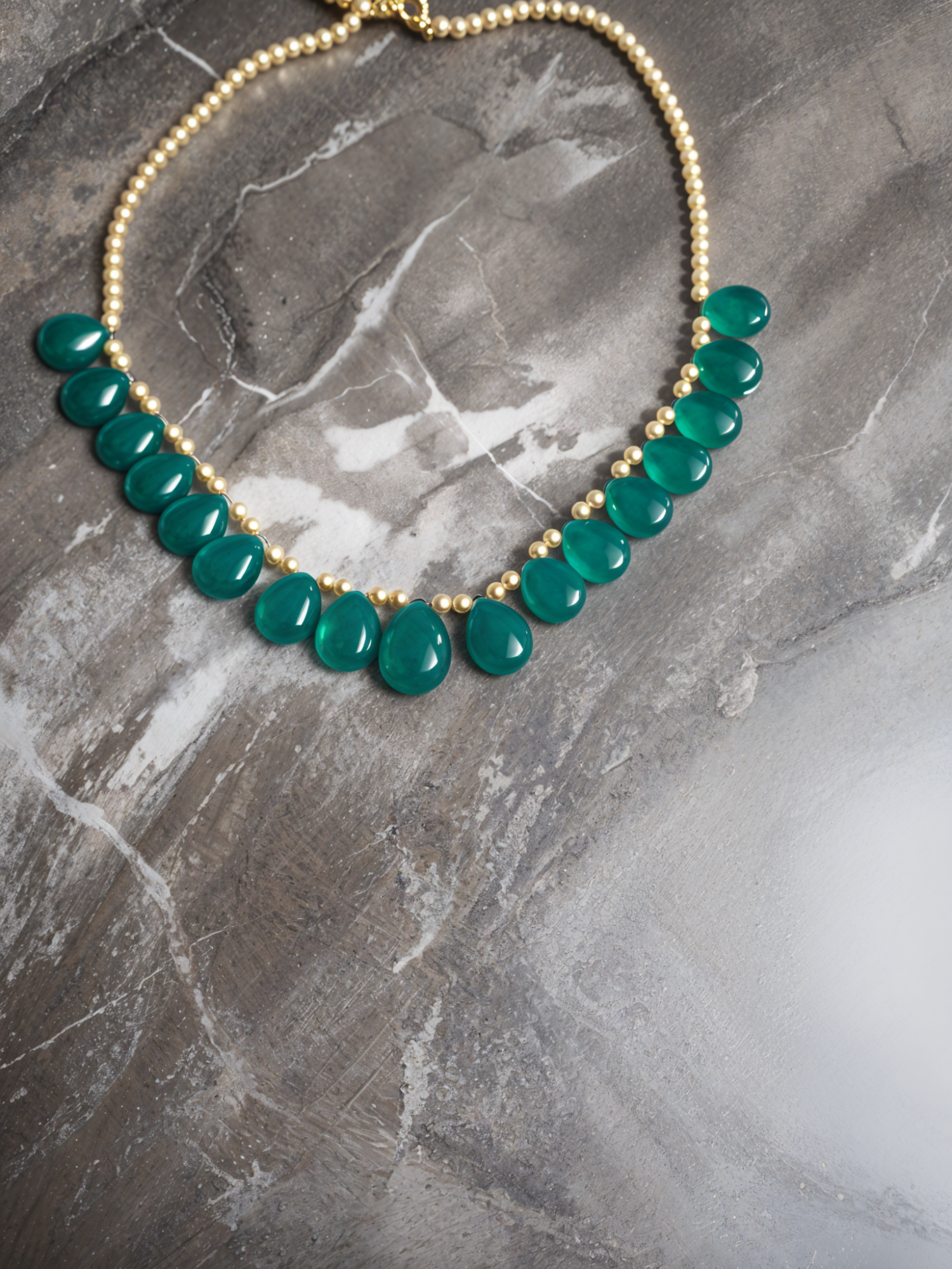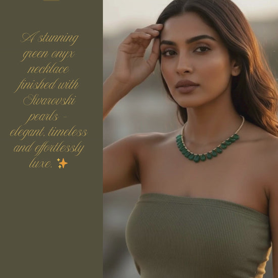 Elevate your jewellery collection with this sophisticated Green Onyx necklace, adorned with lustrous Swarovski pearls. The adjustable design ensures a