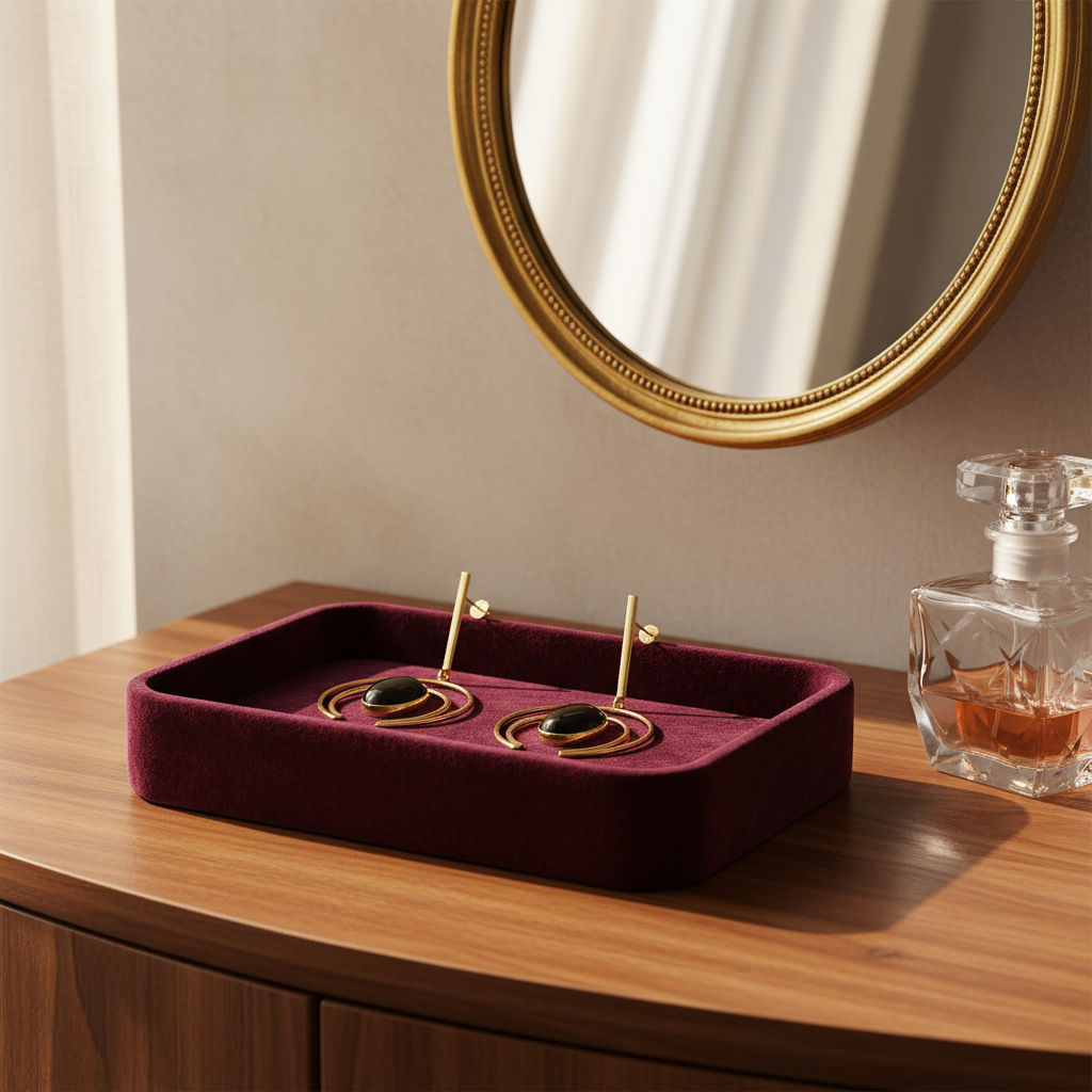 Sculptural brass crescents orbit a glossy black tourmaline for a bold, city-chic statement. Lightweight yet striking, they frame the face beautifully and move from brunch to cocktails with ease.