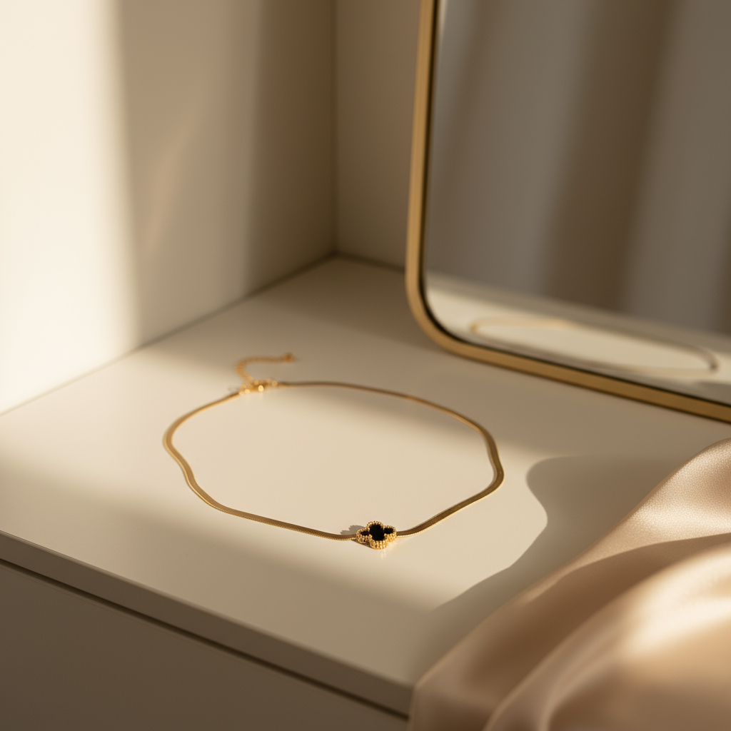 Sleek herringbone chain with a glossy black clover centerpiece—crafted in 18K gold-plated, anti-tarnish stainless steel that’s lightweight, hypoallergenic and adjustable.