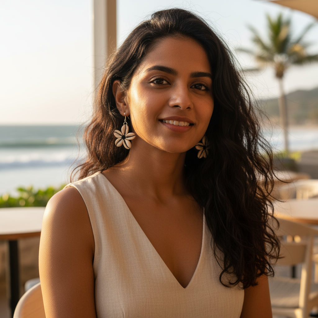 Hand-strung cowries bloom into a chic star silhouette—breezy, feather-light, and endlessly versatile. Nickel-safe hooks, beach-to-brunch styling, and a touch of coastal luxe that lifts linens, resort wear, and festive fits alike.