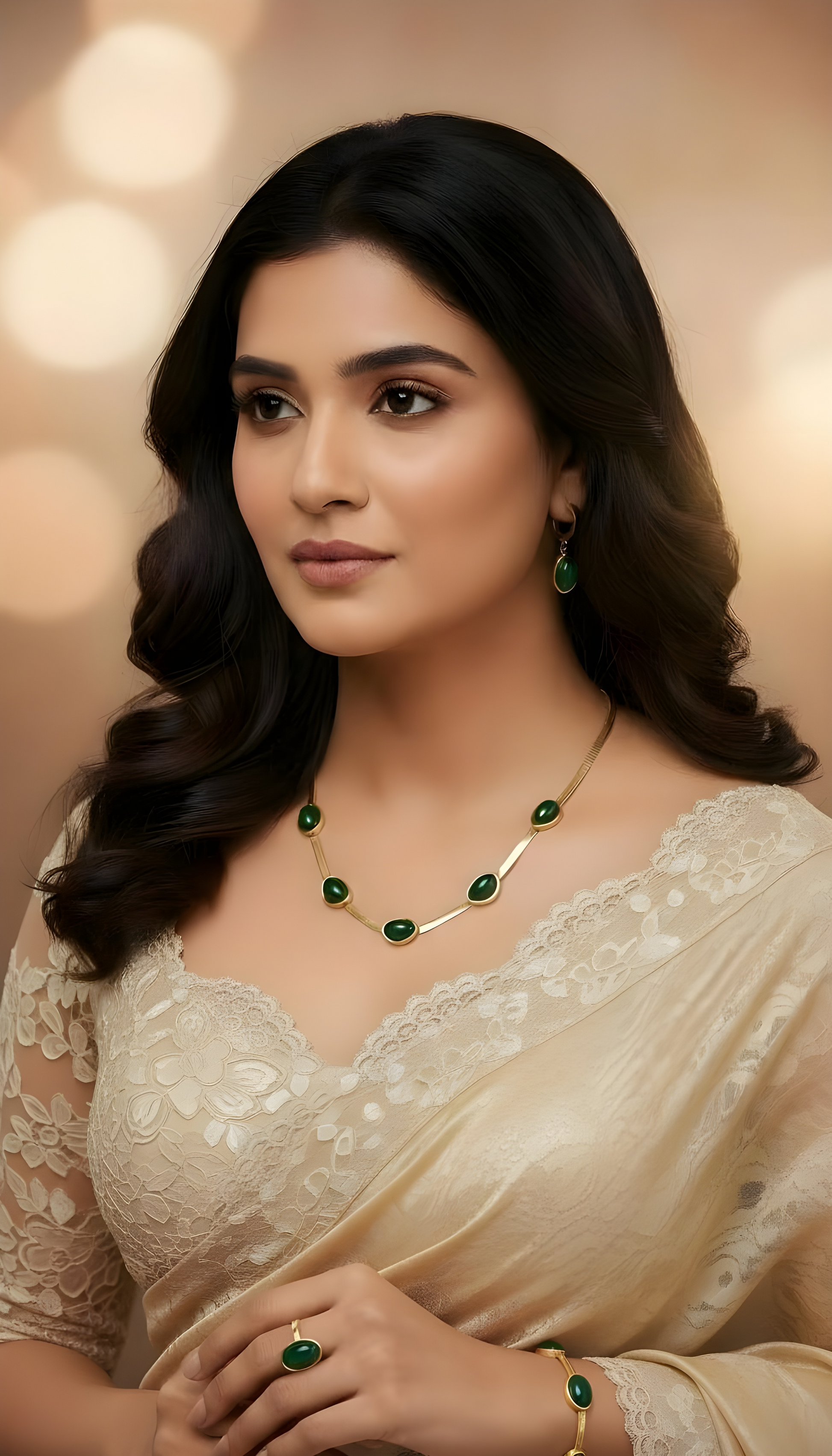 Lush emerald-green crystals bezel-set along sleek snake chains, with matching earrings, bracelet, and ring.